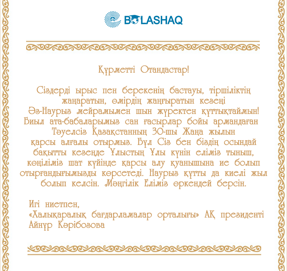ПОЗДРАВЛЕНИЕ ПРЕЗИДЕНТА АО «ЦЕНТР МЕЖДУНАРОДНЫХ ПРОГРАММ» АЙНУР КАРБОЗОВОЙ С ПРАЗДНИКОМ НАУРЫЗ